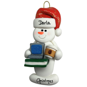 Celebrate the dedicated scholar in your life with this charming Student Snowman Christmas Ornament. This festive snowman is ready for a long study session, wearing a sparkling red Santa hat and holding a stack of green books along with a small laptop featuring a bright blue screen. Complete with a cozy cup of coffee in hand, this ornament is a clever way to recognize a college student, a high school graduate, or anyone working hard to reach their academic goals.